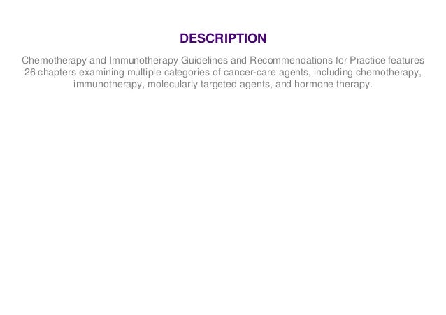 Chemotherapy and immunotherapy guidelines and recommendations for practice. Chemotherapy and Immunotherapy Guidelines and Recommendations for Practice contains extensive details related to every toxicity of antineoplastic therapies with evidence-based approaches for prevention and management. MiKaela Olsen MS RN AOCNS. Chemotherapy and Immunotherapy Guidelines and Recommendations for Practice features 26 chapters examining multiple categories of cancer-care agents including chemotherapy immunotherapy molecularly targeted agents and hormone therapy.
