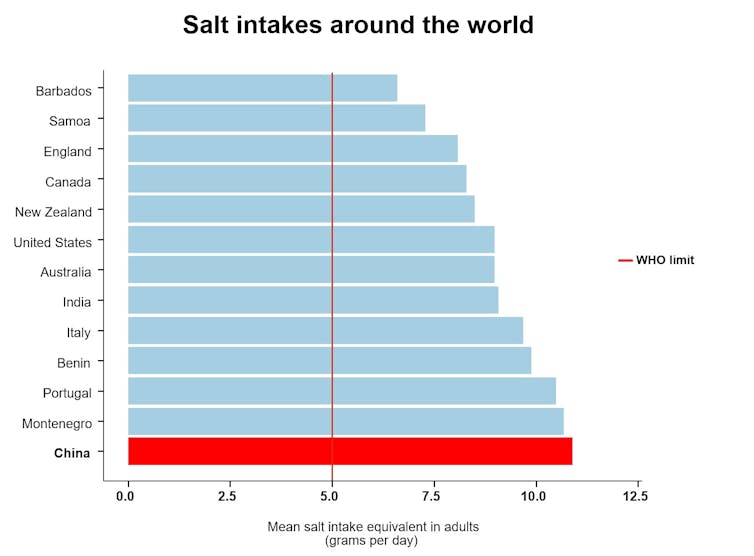 According to the study the estimated mean adult salt intake equivalent in China amounted to 109 grams per day as of 2019. Children 1 to 3 years should eat no more than 2g salt a day 08g sodium. The average intake for men ages 20 and older is even higher.