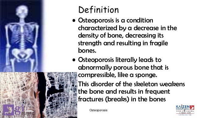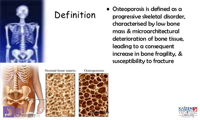 Osteoporosis is a condition of low bone density that can progress silently over a long period of time. Osteoporosis is a skeletal disorder characterised by low bone density and microarchitectural deterioration of bony tissue. Osteoporosis is the scientific name for a disease in which bones become weaker more fragile and brittle predisposing an individual to more cracks and fractures.