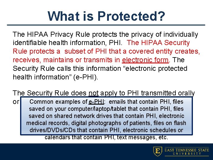 The definitions below are a paraphrased subset of all the definitions contained in the HIPAA Security Rule. Understanding HIPAA Security Rule requirements will help. The HIPAA Privacy Rule protects the privacy of individually identifiable health information called protected health information PHI as explained in the Privacy Rule The Security Rule protects a subset of information covered by the Privacy Rule which is all individually identifiable health information a covered entity creates receives maintains or transmits in electronic form.